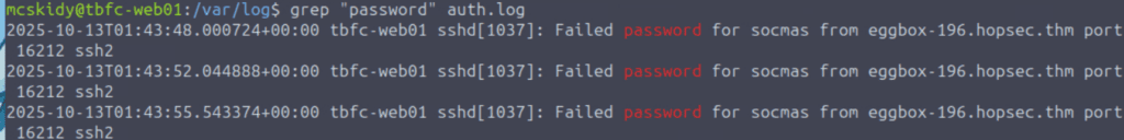 Since we noticed a lot of failed login attempts in auth.log, we’ll want to thoroughly enumerate the user that the attacker was trying to brute force (or password spray) in order to access.
