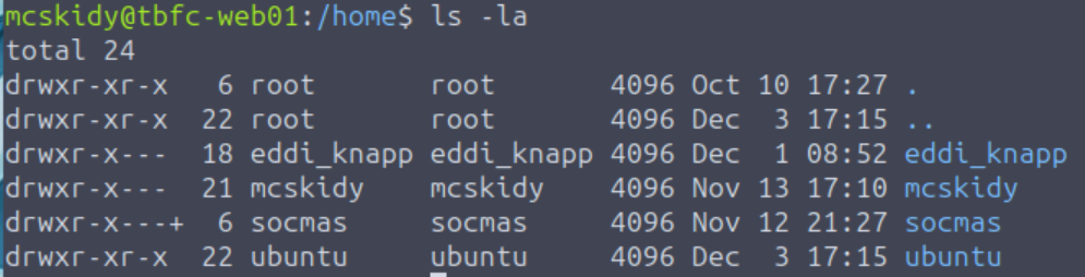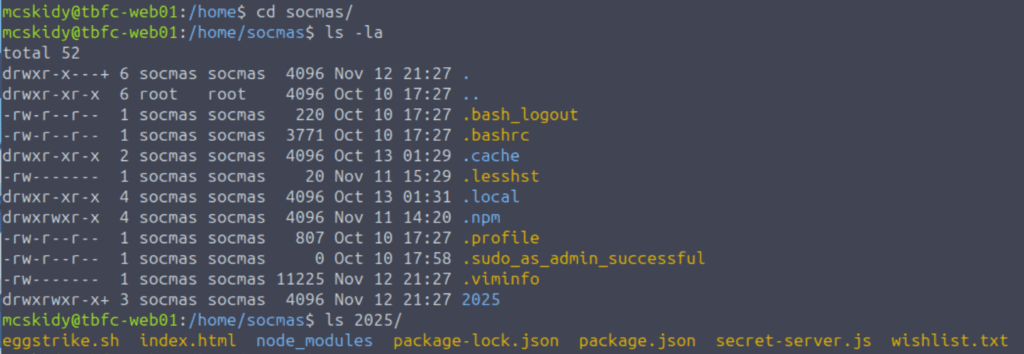 Interestingly, the socmas user directory has special permissions applied using an Access Control List, or ACL – this is shown by the plus symbol ‘+’ for the directory permissions. We can enter this directory and then list the contents: