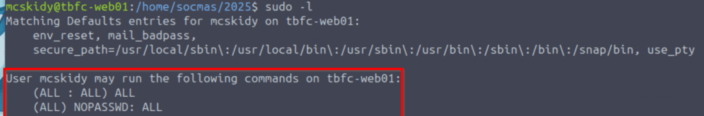In this case, the mcskidy user can run any command as sudo!