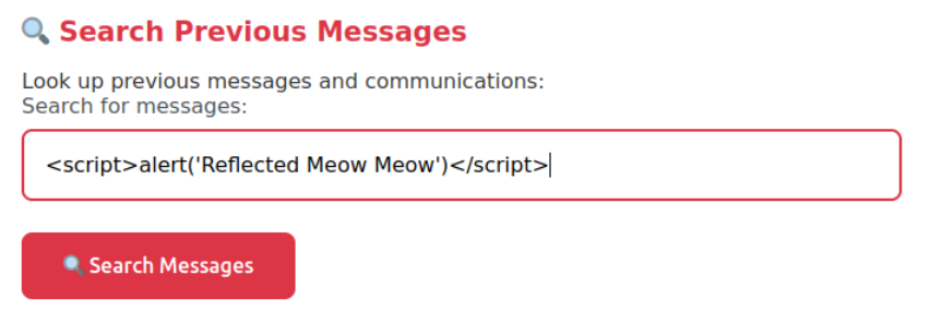 Let’s target the ‘Search Messages’ feature of the web application, using a basic alert payload. Alert payloads are a common way to quickly test for XSS, and are often used as an initial payload before trying other, more complex payloads.