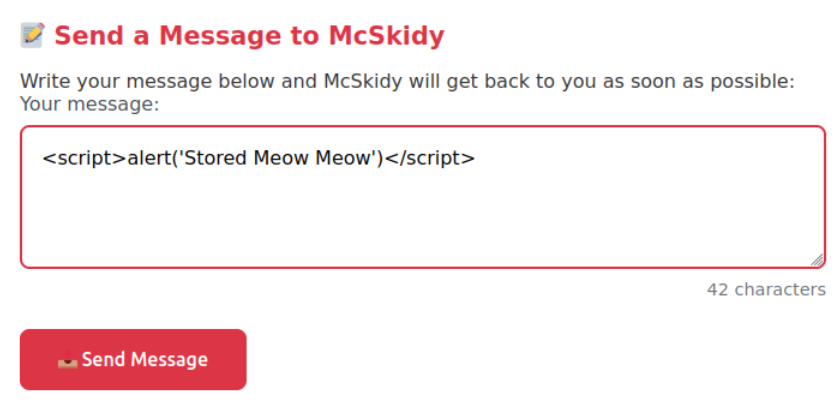 Use a simple alert XSS payload to exploit the vulnerability in the ‘Send a Message to McSkidy’ feature of the web app.