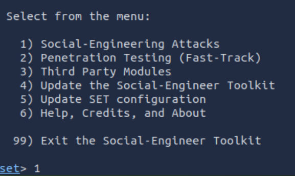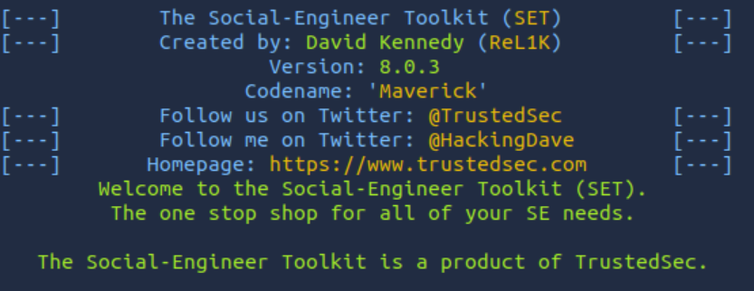 In a new terminal tab, run the ‘setoolkit’ command – you can be in any directory to run it: