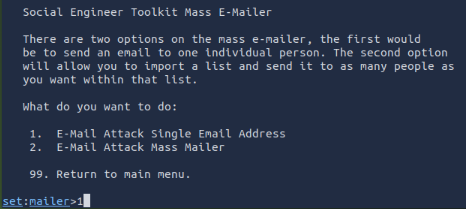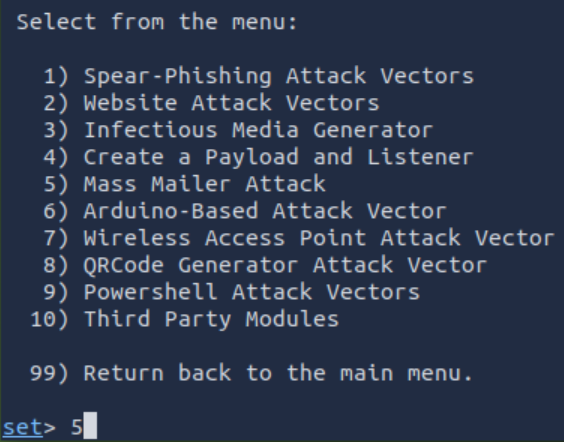 Then enter ‘5’ to enter the Mass Mailer Attack menu: