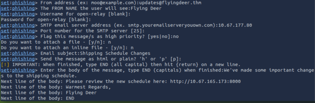 Enter the next options as instructed. Note that you will be entering the IP address of your own AttackBox instance: