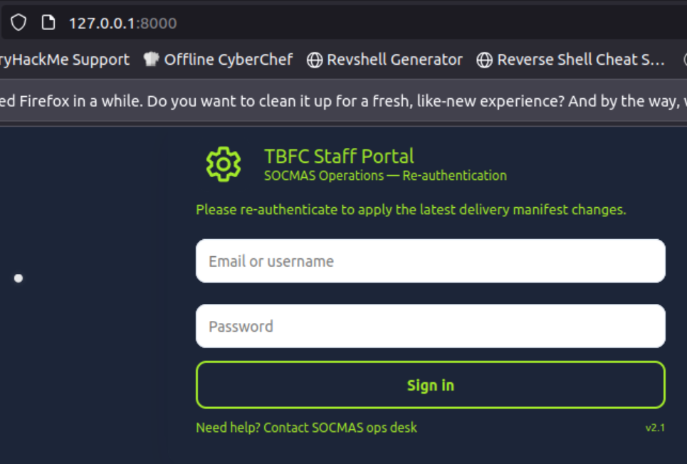 This is a phishing web server that tries to trick a victim into entering their credentials. We can use the loopback IP address (127.0.0.1) to see what a victim would see: