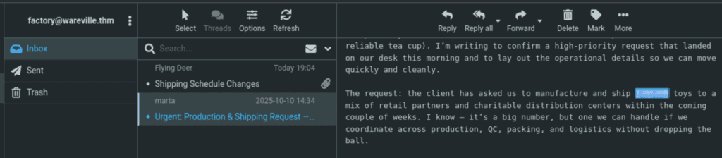 Browse to http://MACHINE_IP from within the AttackBox and try to access the mailbox of the factory user to see if the previously harvested admin password has been reused on the email portal. What is the total number of toys expected for delivery?