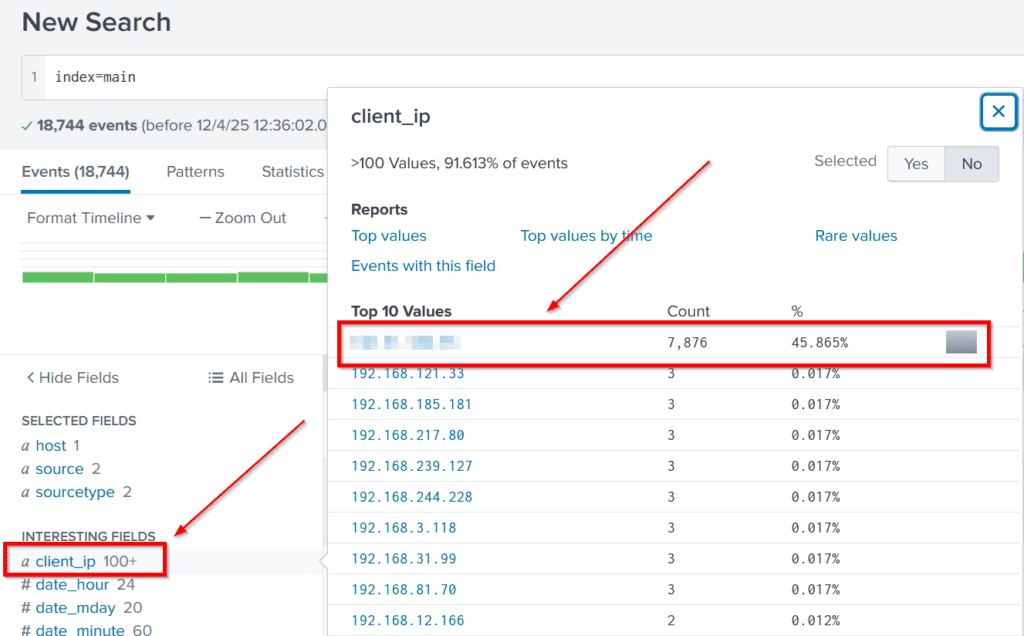 Use the client_ip field to quickly drill down and discover a suspicious IP address.