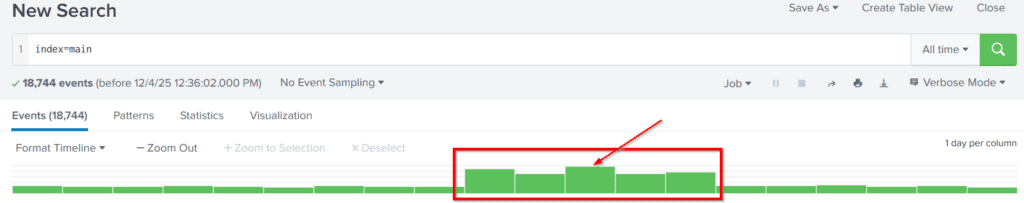 To answer this question, we don’t even need to perform any additional action because Splunk by default (given the timeline of our data) should display the number of events per day right on the dashboard. We can clearly see a large increase in the number of events over a 5 day period, with the third day having the most events. You can hover over each day to find out exactly how many event logs we have per day.
