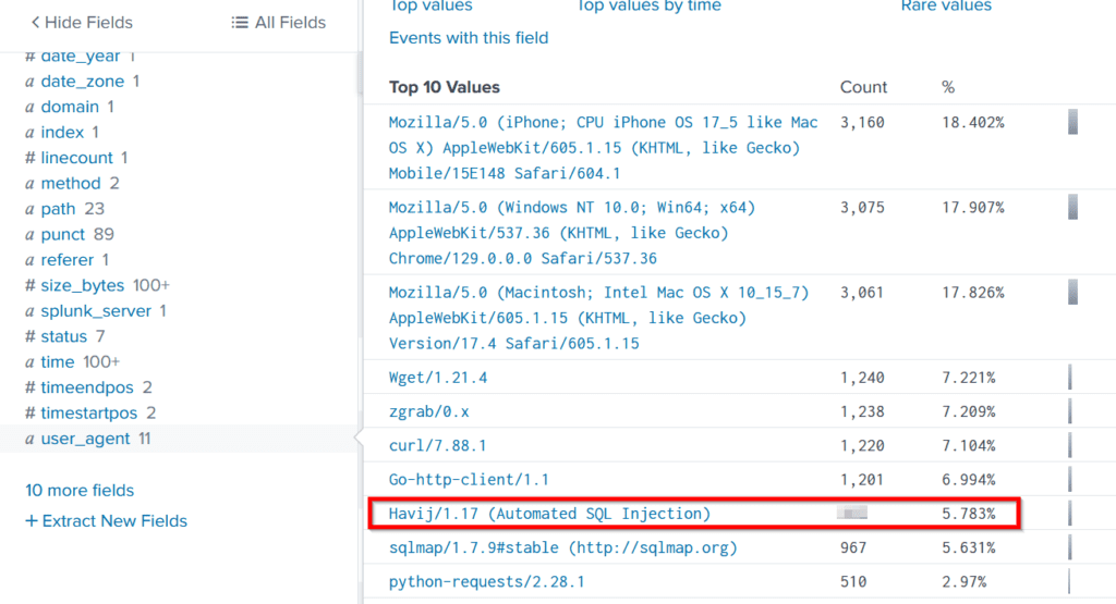 I used the ‘user_agent’ field to find out the event counts for all users: