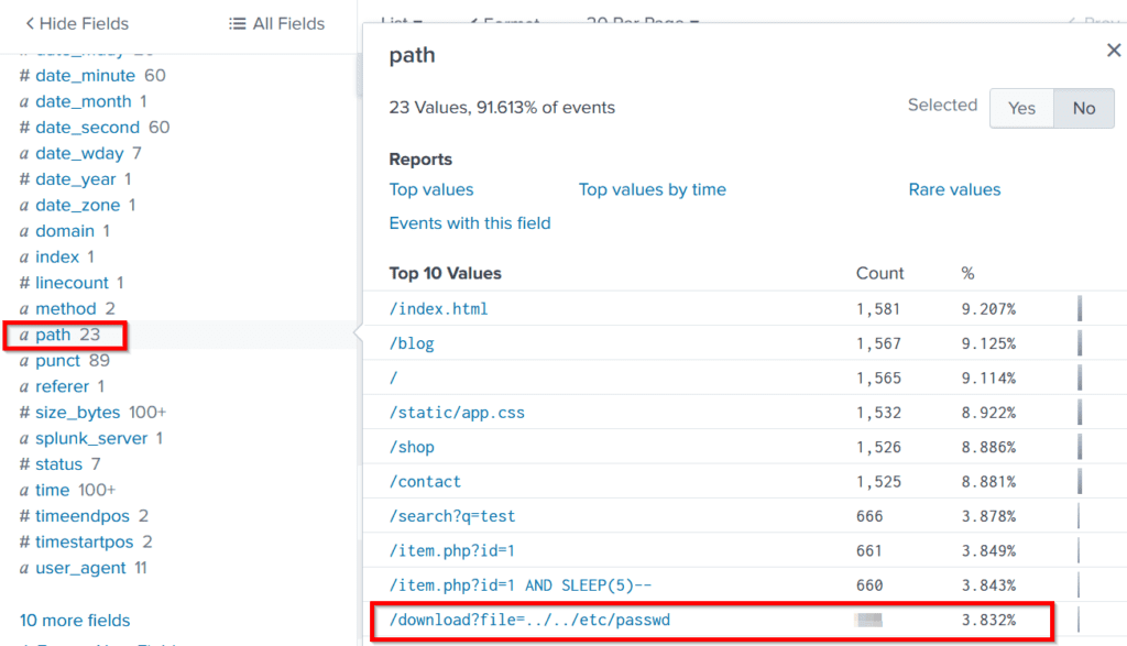Since I didn’t know if this was the only path traversal payload attempted, I ran a report for the ‘path’ field to see the Top Values. We can see that there are only 23 total values, so I knew it would be quick to glance through it and find any other attempts at path traversal: