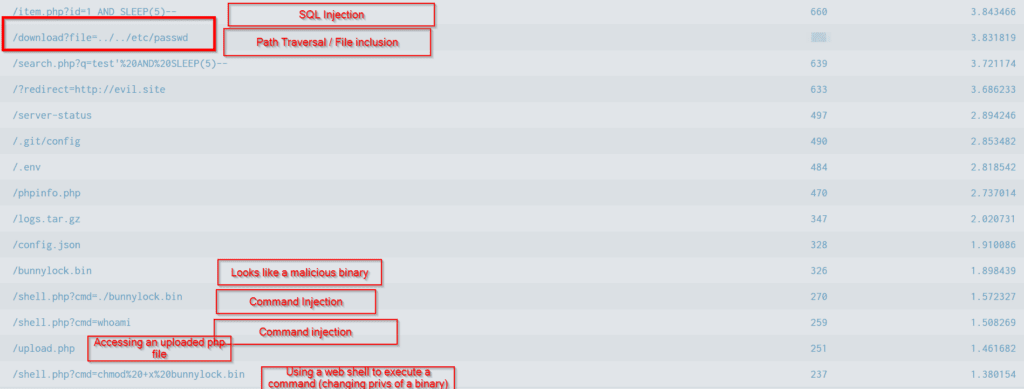 A next logical step would be to investigate specifically what payloads were attempted using the ‘path’ field. When we do this, we can also see an attempt at path traversal using the ‘file’ parameter to perform a file inclusion attack: