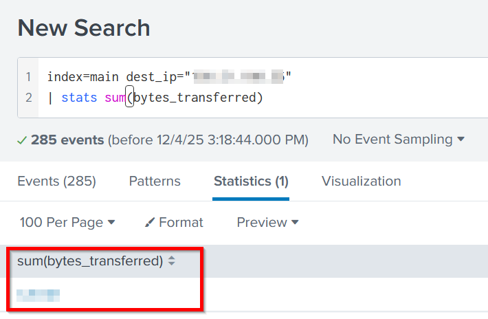 Noting that this IP address would correspond with the ‘dest_ip’ field in the firewall logs, I ran the following search: