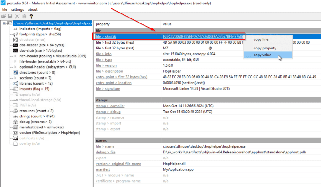 Let’s get back to the task – finding the sha256 sum of the HopHelper executable. Open the file in PEStudio, then look for the file > sha256 property as shown below: