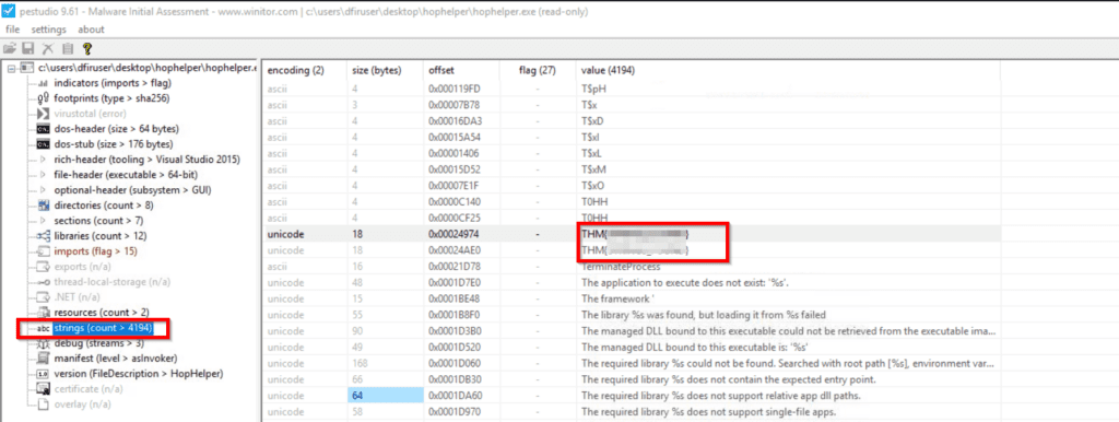 Static analysis: Within the strings of HopHelper.exe, a flag with the format THM{XXXXX} exists. What is that flag value?