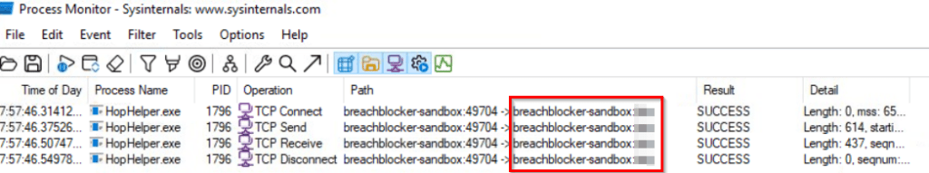 After detonating the malware executable, stop the ProcMon capture and use two filters – one for the Process Name (HopHelper.exe) and one for TCP Operations (make sure to select ‘contains’ TCP).