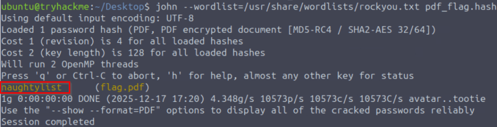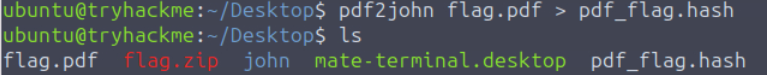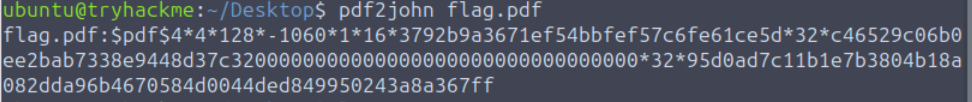 Now I can crack the hash contained in the pdf_flag.hash file using john the ripper. This cracked in less than a second: